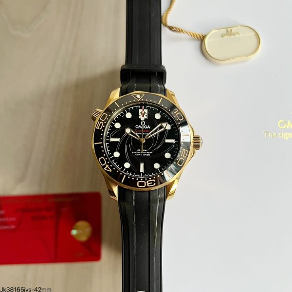 O design do Omega Seamaster 007 300M 42MM é inspirado na longa tradição da linha Seamaster, combinando elementos clássicos com inovações modernas. A caixa banhada a ouro traz um ar de luxo, enquanto a pulseira de borracha oferece um toque esportivo, tornando-o adequado tanto para ocasiões formais quanto informais. O mostrador texturizado preto e o aro de cerâmica adicionam profundidade ao design, criando uma estética sofisticada e atraente.