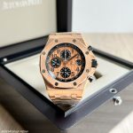 O Audemars Piguet Royal Oak Offshore é conhecido por seu design icônico e robustez. Com um tamanho de 42 mm x 15,5 mm, este relógio é ideal para quem busca uma peça que se destaque no pulso, sem perder a elegância. A caixa é feita em aço inoxidável 316L sólido, banhado a ouro rosa 18K, trazendo um toque de sofisticação. A coroa e o empurrador são em cerâmica, proporcionando um contraste elegante e resistente.