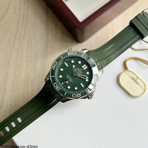 A linha Omega Seamaster Diver 300M é conhecida por seu design sofisticado, e esta versão super clone não é exceção. O mostrador texturizado de onda verde traz um toque visualmente impressionante que, além de ser esteticamente atraente, reflete o legado náutico do Seamaster. O aro de cerâmica verde adiciona resistência extra, garantindo que o relógio mantenha sua aparência impecável ao longo do tempo.