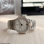 O Super Clone Patek Philippe Nautilus 36MM Prata Branco Brilhante é uma obra-prima, com cada detalhe meticulosamente desenhado para replicar fielmente o design icônico do modelo original. Seu mostrador branco contrasta perfeitamente com a caixa de aço inoxidável 316L, destacando o luxo discreto que a linha Nautilus oferece. Além disso, o aro é adornado com brilhantes, elevando o nível de sofisticação e proporcionando um toque exclusivo de luxo ao visual geral.
