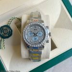 Com uma caixa robusta de aço inoxidável 904L e uma moldura adornada com brilhantes, este relógio traz o melhor da engenharia suíça e o glamour dos materiais mais refinados. Além de um visual impactante, o relógio é equipado com um movimento cronógrafo automático 7750, proporcionando alta precisão para medições de tempo. Este é o relógio perfeito para aqueles que buscam um equilíbrio entre elegância e funcionalidade.